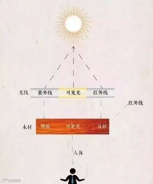 木材,给人视觉上的和谐感,是因为木材可以吸收阳光中的紫外线(380nm以下),减轻紫外线对人体的危害;同时木材又能反射红外线(780nm以上),这一点也是木材使人产生温馨感的直接原因之一。