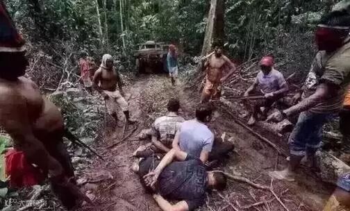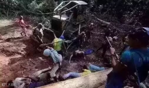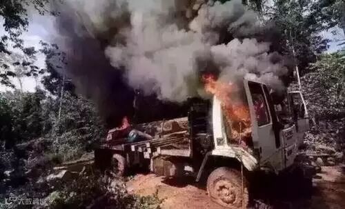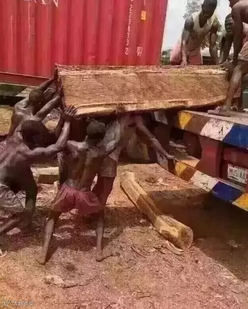 由于当地设备落后,只能徒手把重达一吨的木材装上车。