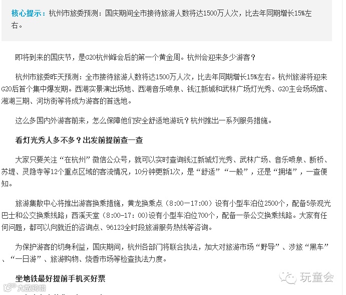 做为山水江南的浙江即使不是长假,也是全国各地游客喜欢来的地方,尤其是今年的G20峰会上演的《最忆是杭州》吸引了全世界人民的眼球,国庆长假,新版的《西湖印象》更是让大家多了一个去杭州的理由!只是人,还会少吗?