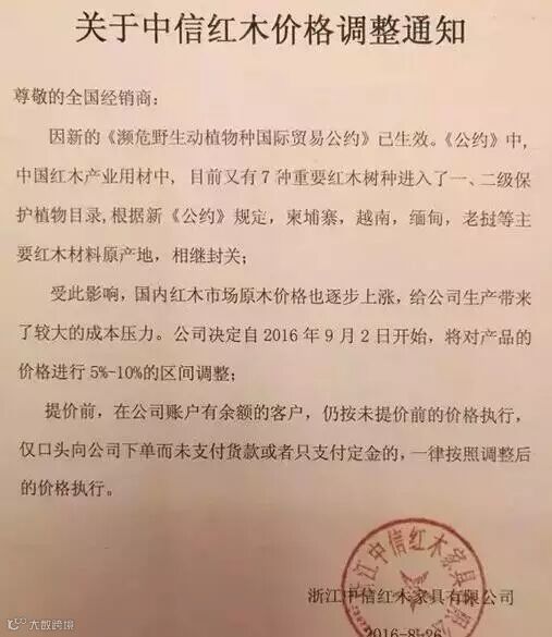 8月26日,中信红木微信公众号发布一条《关于中信红木价格调整的通知》,全文如下: