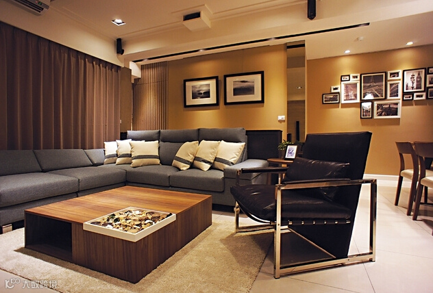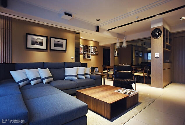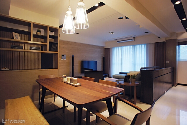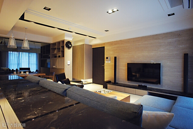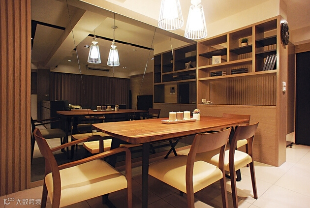 整体运用纯粹的线条及具温润颜色的媒材,强调空间中的精緻与品味定律,舒适及尊荣是可以相辅相成的。客、餐厅空间以开放方式为主,有效的连贯开阔、敞朗的空间调性,餐厅一旁的格柜设计,同时是玄关与厅区的介面,利用开放格柜的安排,满足收纳、展示机能,同时延展视觉的穿透旨趣。主牆以大面积的灰镜取代制式的装饰牆面,延伸出开阔的场域表情。