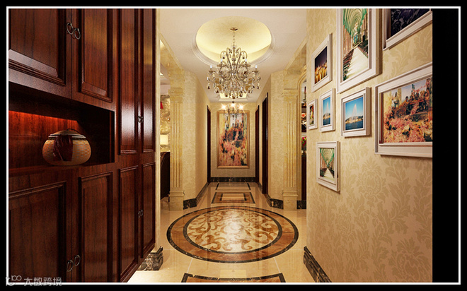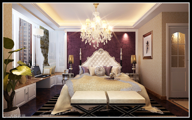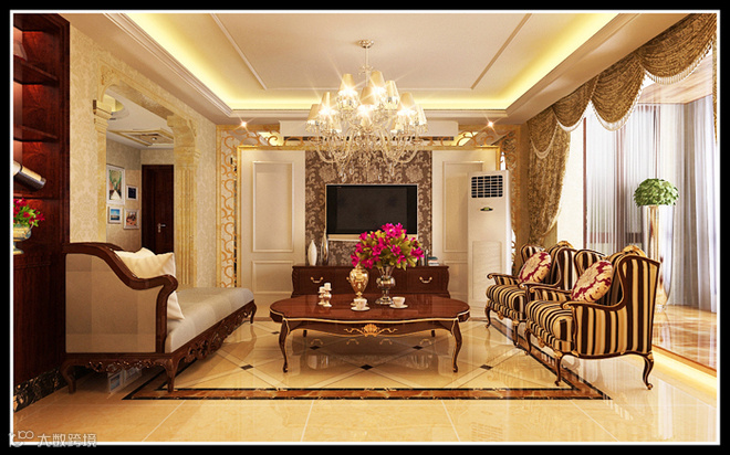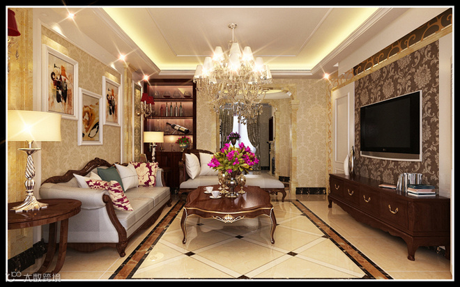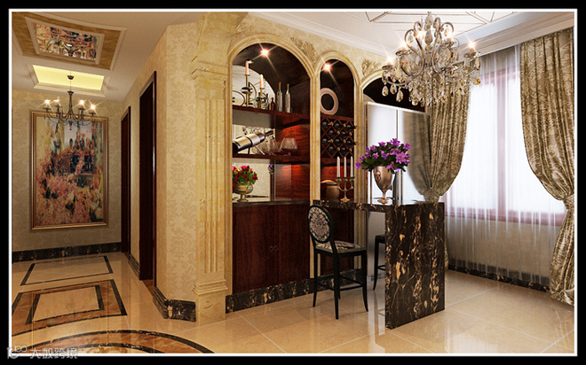 此方案的风格定位为欧式新古典风格。它强调的是高贵典雅、雕刻精细的欧式新古典风格与色彩丰富、颠覆传统的巴洛克风格的结合。同时围绕着业主对房子功能的需求,合理的对空间进行了改造与功能划分。业主是个很时尚的人士,本案在设计餐厅的地方舍弃了传统的餐桌椅,用吧台来代替,吧台和酒柜很好的衔接在一起,并且将冰箱和酒柜嵌入在墙体里,酒柜里用了镜面映射空间的富饶景象,饱和的色彩令人沉醉迷恋,像是飘飘然漫步在星光璀璨的城堡里。餐厅正对面有一个壁炉,壁炉中的干柴充满了自然气息。使空间更加丰富与温馨。达到各功能空间融会贯通的目的。整个方案表现出空间沉稳和大气的性格,显示了一种高贵奢华的生活意识,在视觉上充满了动感与惊喜,使时尚与古典得以完美体现。