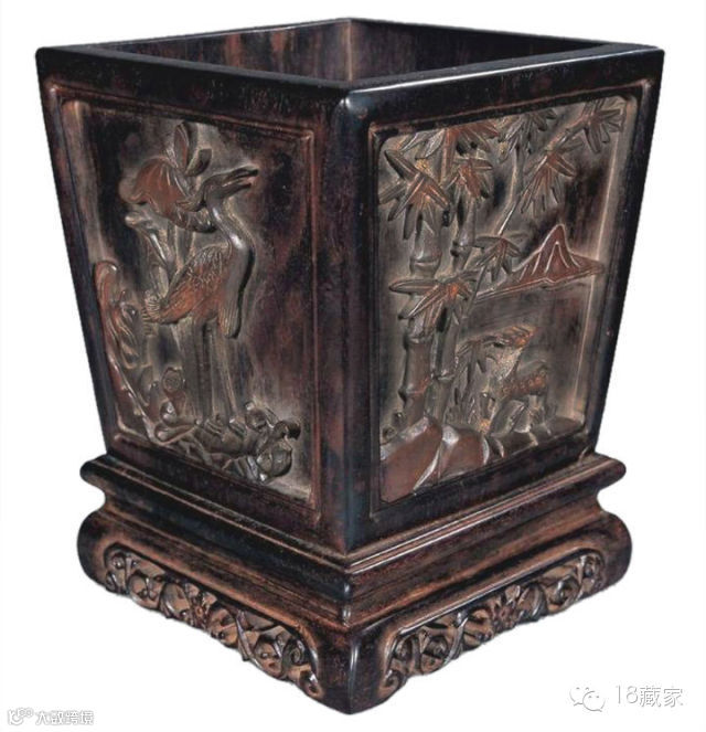 这件紫檀嵌鸡翅木笔筒上宽下窄,体型较小,造型独特。筒外壁雕刻竹、花、鸟、鹿、湖石等图案。此笔筒外壁雕饰布局疏朗有致,雕琢及开槽均精细得当。图案富于自然生趣,再经紫檀之深沉木色的衬托,愈显清新莹润。
