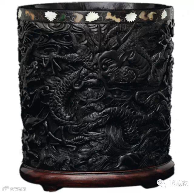 此紫檀笔筒表面满是浮雕鱼龙海兽图像,最引人瞩目的主角是气势慑人的二龙。值得注意的是,它们的形态、风格与表现方式与其他造型奇古的海兽有异。二龙中,一为海水龙,另一为腾云龙,它们本来就是明代龙纹两种最常见的表现方式。