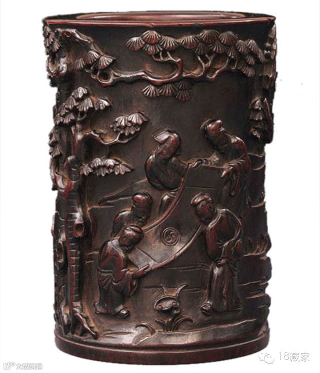 这个笔筒呈直筒形,以上等牛毛纹紫檀制成,色泽深沉,淡雅质朴。腹部以百宝嵌工艺嵌饰三组人物: