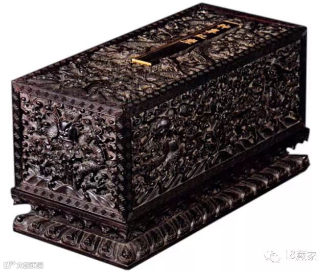 这个紫檀龙纹册页盒,选料上乘,木质细腻,颜色黑紫。长方形盒盖,五面满饰海水云龙纹,龙形浮现于海水云纹之间,器宇轩昂,盘曲遒劲。正是真龙天子主宰江山社稷之意,标志其无上的尊贵。须弥座式底座,饰以俯仰莲纹,又称“巴达马”,此盒制作精细,雕刻工整,为典型“紫檀工”。盒面上填金四字铭文“神皋纪庆”,为盒内旧物之标题。