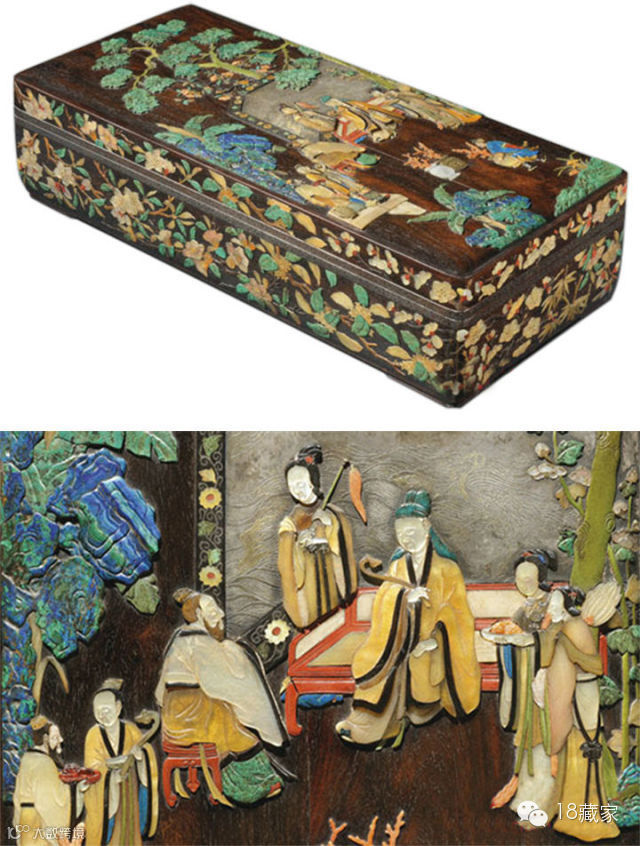 本盒盖以高士雅集作饰,人物于庭院博古论文。其中主人翁手执如意,座前设珊瑚数盆,寓意祥瑞,或乃诞辰庆典之景,疑为拜寿贺礼。