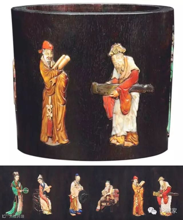 这三组人物典故各异,风姿不同。雕刻极尽精湛,人物衣着、头饰、配带精心搭配以各色象牙、海螺、硬木、玉石、宝石镶嵌而成,色泽历久弥鲜,美轮美奂,尽显风雅。此笔筒嵌螺钿“大清乾隆年制”篆书款,刻工精绝,颇具皇家风范。