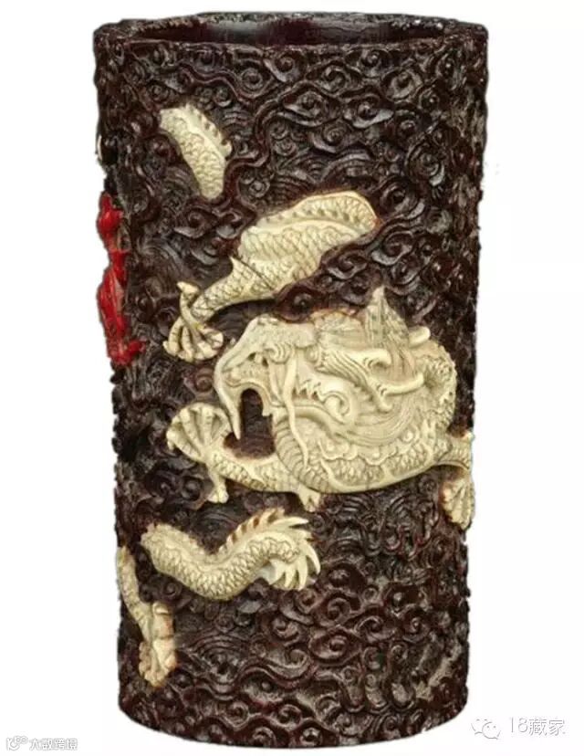 二龙各自盘踞在椭圆形状笔筒较宽的一面。身形较大的龙,以矫跃之姿从海中翻腾跃出海面,激起汹涌波涛,龙身呈现双S形的盘旋姿态。龙首丰颐而突出,长喙巨开,脑后鬃鬣(zonglie)分为两股向外奋张,神态威猛有力,成功地表现巨龙扭身转首,彷佛要破壁飞出的瞬间姿态,可说是整个浮雕最精彩之处。另一面,身形较小的龙则是腾云飞翔,身躯有部分出于画外,其势如从空中俯冲而下,迅即转身急停。它的龙爪向前探出,目光恰与另一龙遥相对望,两者俨然形成分庭抗礼之势。