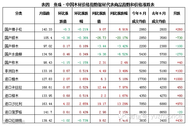 其中,进口原木指数本月小幅回落报收141.03点,月环比下跌0.26点,跌幅为0.18%,较去年同比上涨0.36点,涨幅为0.26%。据鱼珠·中国木材价格指数网监测数据显示,进口原木本月成交量较上月减少了3.585%,成交额减少了2.12%。盘面上看,7个代表品价格指数4涨3跌,表面数据似乎升势占优,其实则不然。今年以来表现最为活跃的铁木豆连续两个月出现下跌,商品价格指数报收205.04点,较上月下跌0.92%,成交价报4600元/立方米,较高峰时期下跌了300元/立方米。作为户外园林材的第一大材种菠萝格,指数大幅回落跌1.52%,成交价报4600元/立方米。菠萝格量能继续萎缩,显示楼市持续低迷对其冲击依然突出。权重品表现不力,大盘想要攀升只能是空中楼阁。价格指数上升的代表品中,瓦泰豆、依奇及山樟成交量均表现平平。指数出现攀升,主要是因为这些材种前期价格不断回落盘整,在调整基本到位后逐步开始企稳。因此,整个6月,进口原木市场在淡季气氛笼罩下,成交量继续萎缩,指数缺乏足够支撑只能被迫回调盘整。