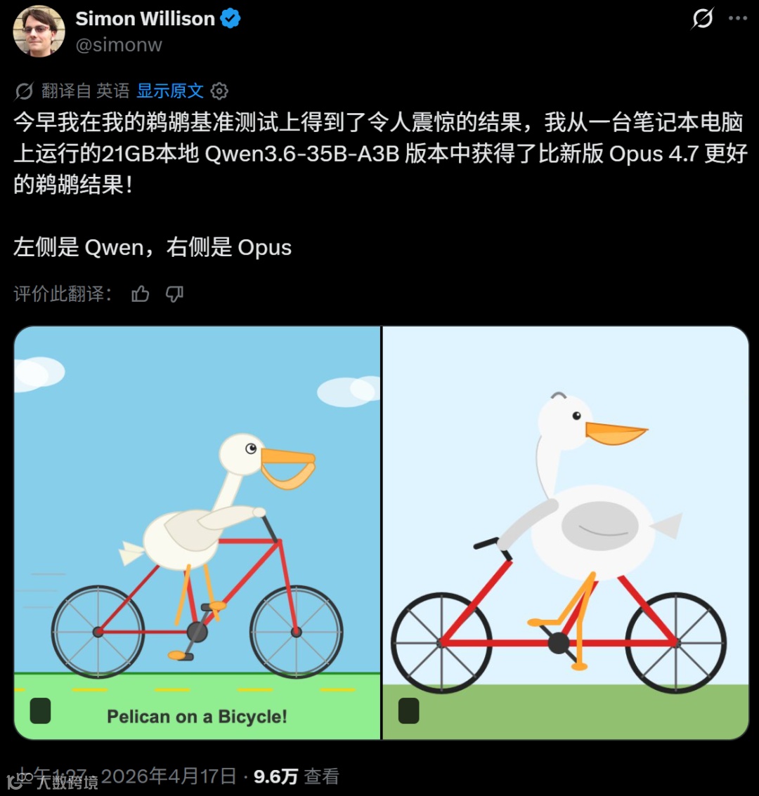 同样是在昨天晚上,千问开源了 Qwen3.6-35B-A3B(350 亿参数,激活 30 亿),有人还表示,在自己 MacBook Pro M5 上通过 LM Studio(以及 llm-lmstudio 插件)运行的千问模型生成「鹈鹕骑自行车」效果要比 Opus 4.7 好。