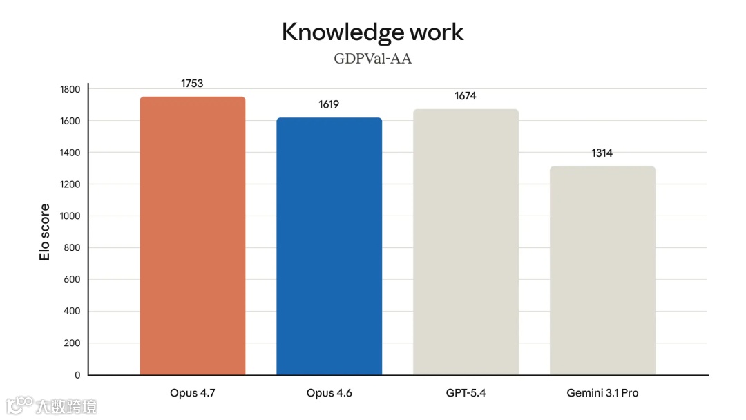 实际应用能力提升。除了在财务代理评估中获得领先水平(见上表)外,Anthropic 的内部测试表明,Opus 4.7 比 Opus 4.6 更高效地进行财务分析,能够生成严谨的分析和模型,呈现更专业的演示文稿,并在各项任务之间实现更紧密的整合。Opus 4.7 在 GDPval-AA 评估中也处于领先水平。