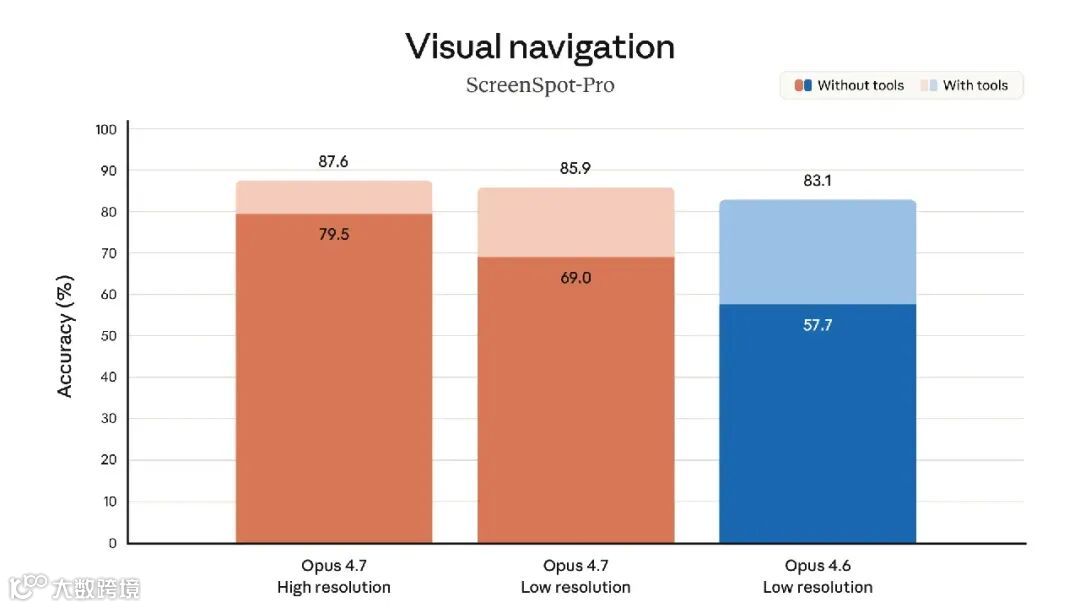 改进的多模态支持。Opus 4.7 对高分辨率图像的处理能力更强:它可以处理长边高达 2576 像素(约 375 万像素)的图像,是之前 Claude 型号的三倍以上。这为依赖精细视觉细节的多模态应用开辟了广阔的空间:智能体可以读取密集屏幕截图、从复杂图表中提取数据以及需要像素级精确参考的工作。