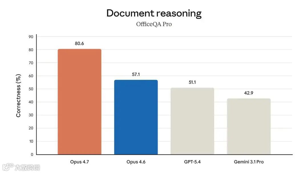 Opus 4.7在此跑分达80.6%,远超Opus 4.6的57.1%,以及GPT-5.4的51.1%、Gemini 3.1 Pro的42.9%,跑分分别是后两者的1.6倍、1.9倍。
