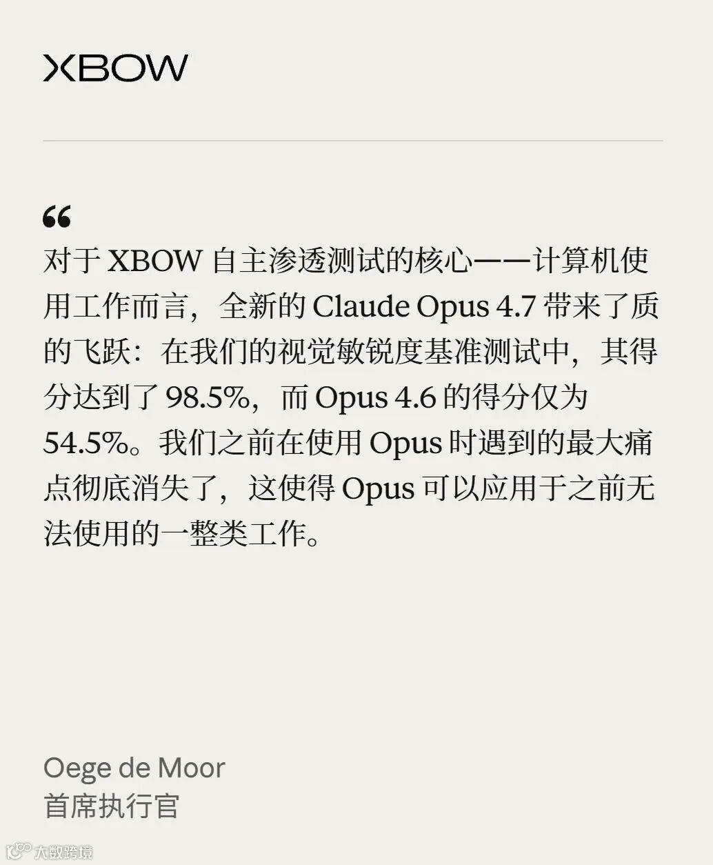 Opus 4.7视觉能力在XBOW等基准测试中得分较4.6翻倍,从54.5%升至98.5%的近满分水平,也让其计算机使用能力较4.6有天壤之别。