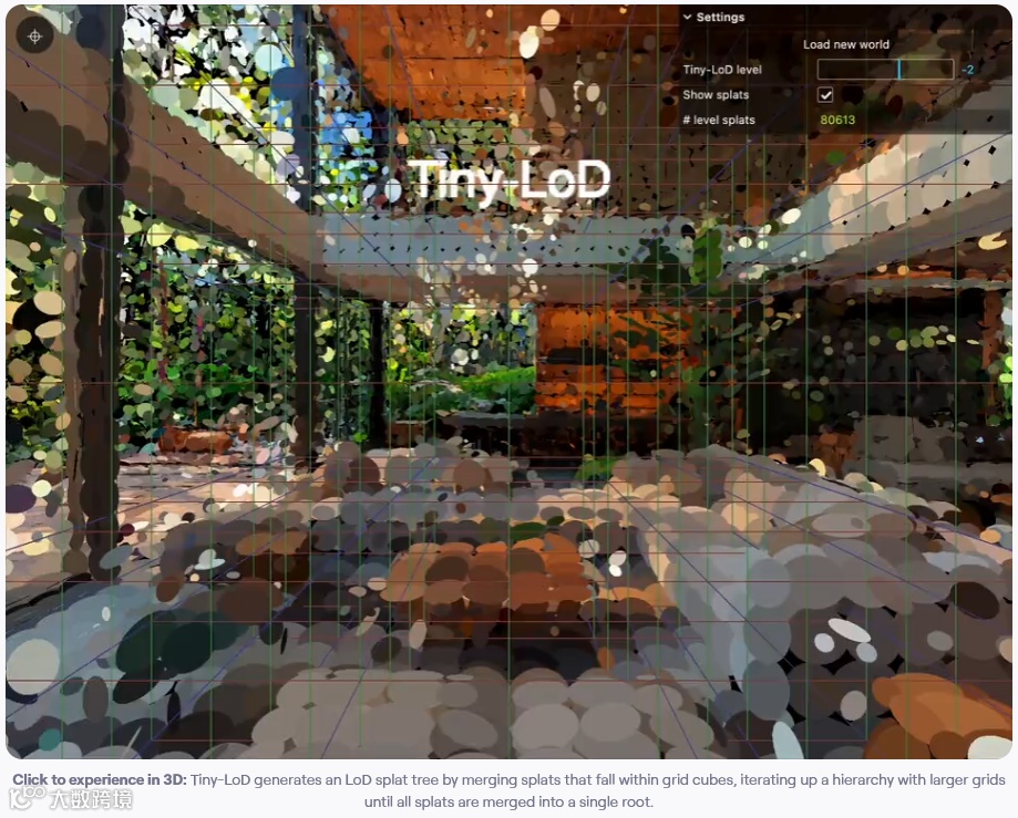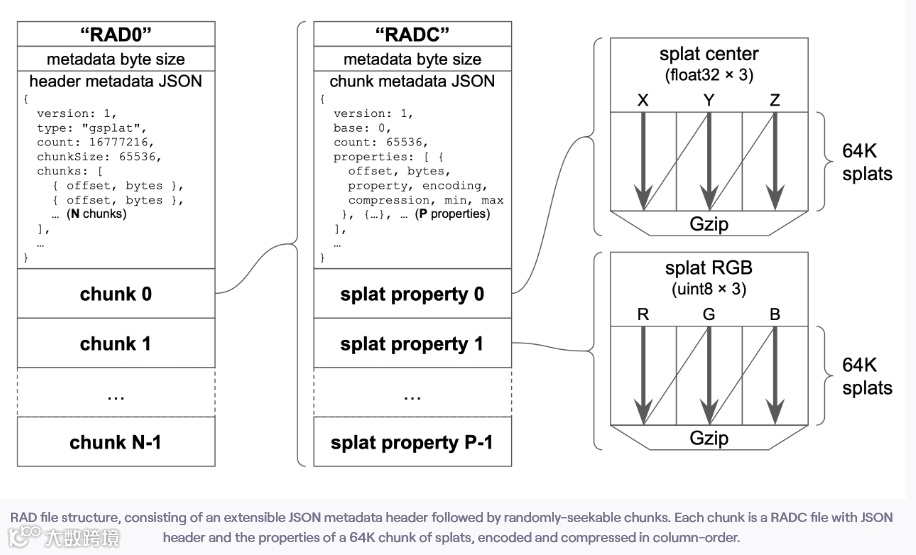 RAD文件格式突破传统PLY/SPZ局限:首部JSON元数据实现随机访问;数据切分6.5万点/块的空间分区结构;采用按列压缩存储,千万元素仅需200MB。打开场景时先加载根节点块,随即展现完整框架,后续细节随动效渐进呈现。