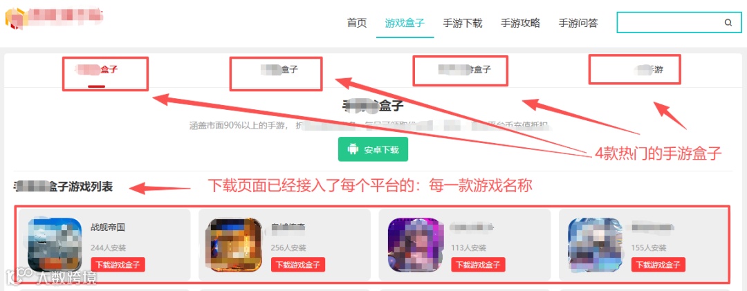 游戏下载站养站系统已部署四款手游盒子: