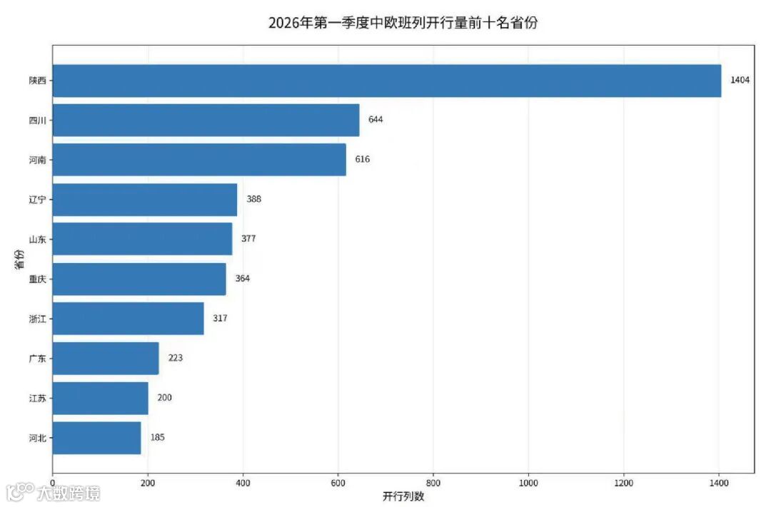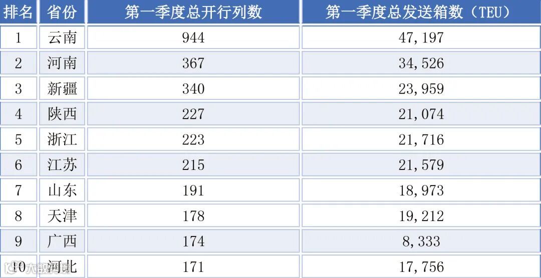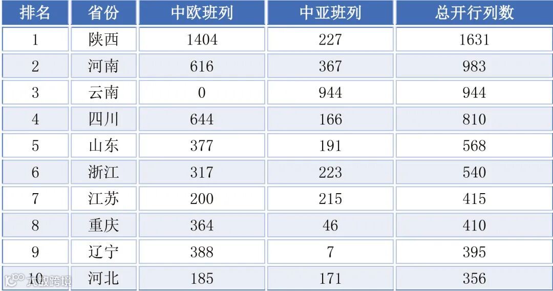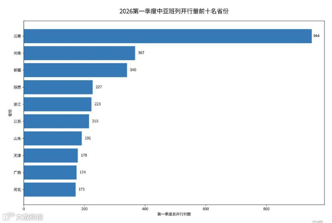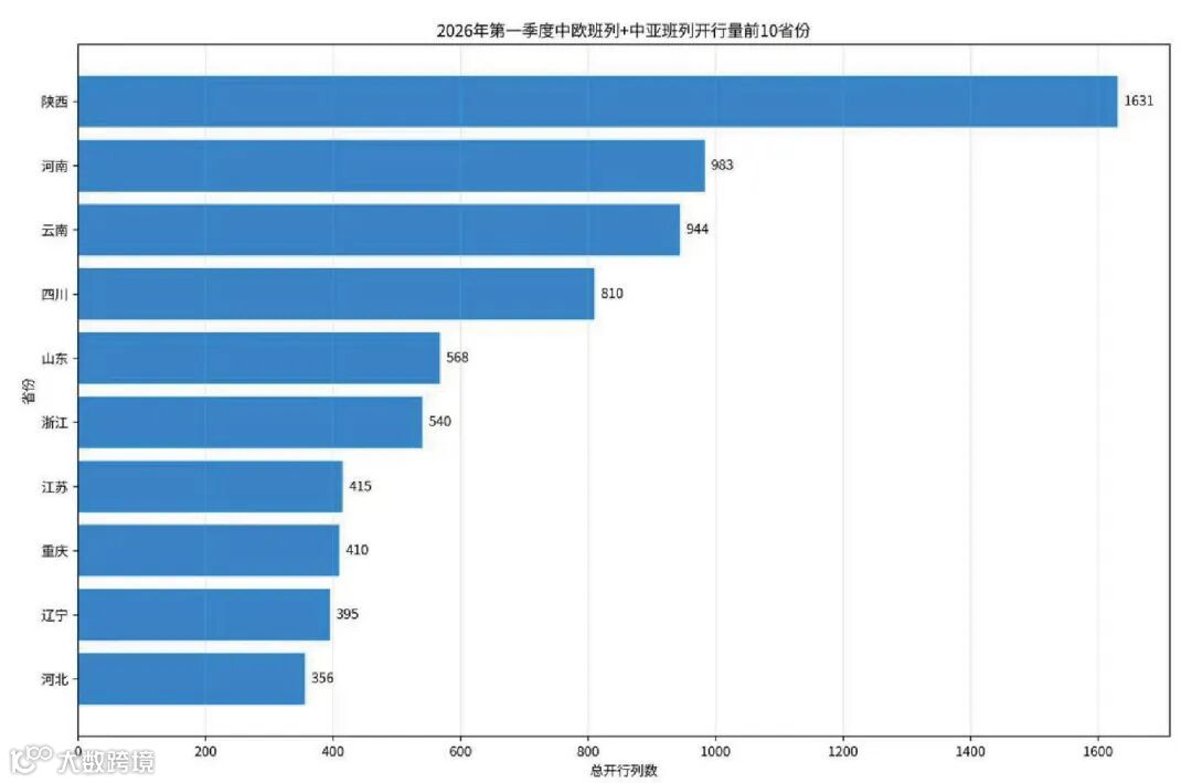 一季度全国各省班列开行呈现显著区域特征:陕西省以1631列总量稳居首位,中欧班列贡献突出;河南省与云南省分列二、三位,其中云南省运量全部来自中亚班列,成为该线路核心枢纽。