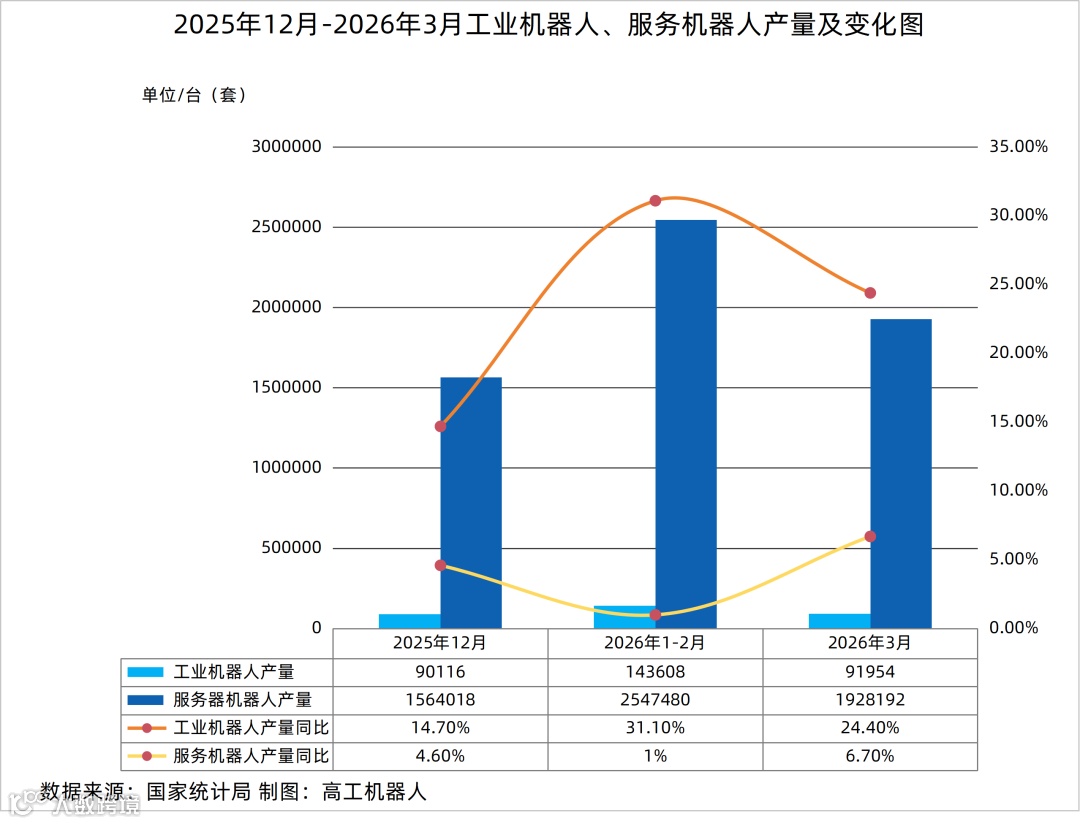 3月,工业机器人产量9.2万套,同比增长24.4%;服务机器人产量192.82万套,同比增长6.7%。