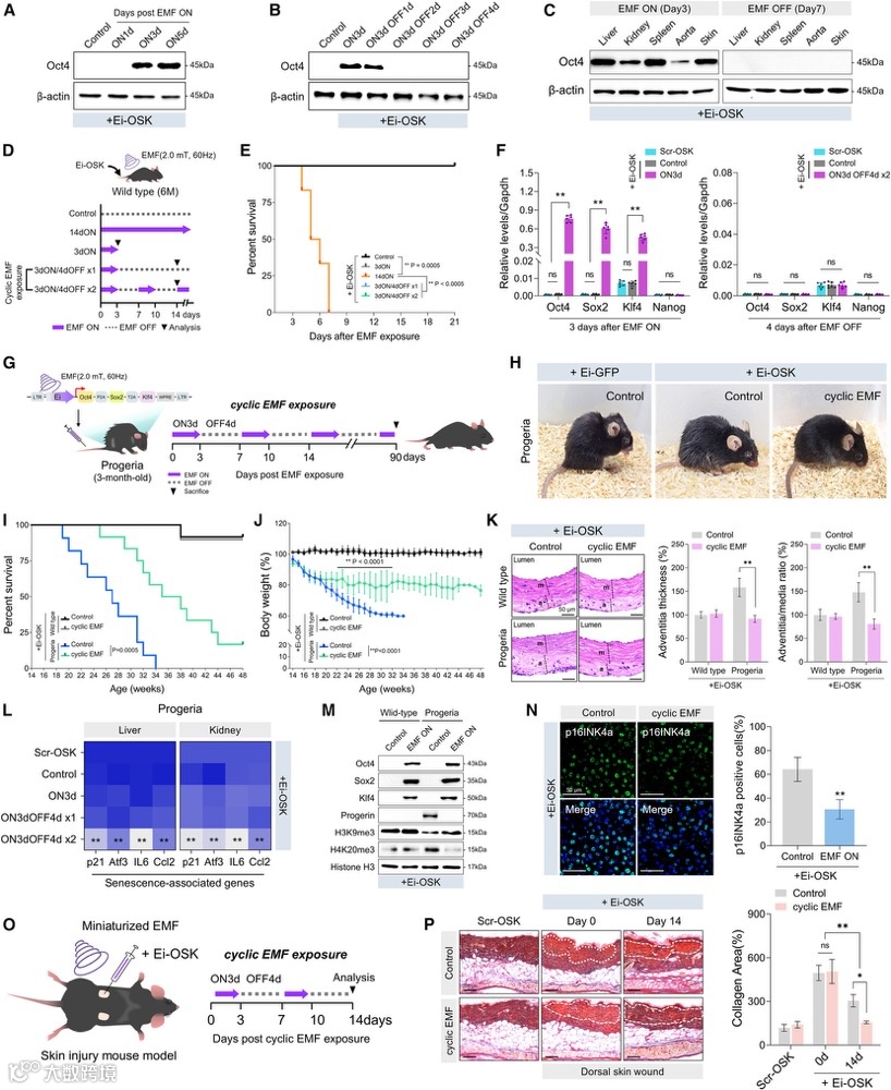 团队将电磁场响应元件(Ei)连接至山中因子(OSK)启动子,导入早衰小鼠体内。"开3天关4天"节律照射使OSK短暂表达,在维持细胞身份前提下清除衰老印记。治疗后小鼠存活率显著提高,血管外膜增厚逆转,皮肤伤口胶原堆积量降低近50%。