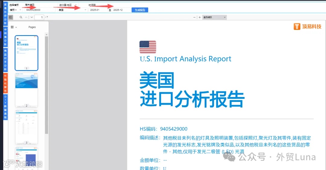 选定核心产品与目标市场后,AI自动生成专业进口分析报告。输入产品名称和市场,即可获取深度分析结果。