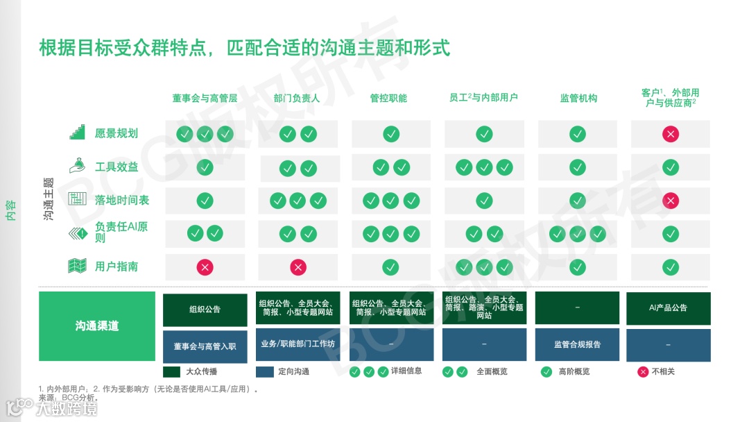AI治理的成功始于分层沟通策略。针对不同群体需定制信息:面向董事会与高管,重点阐明AI如何驱动竞争优势及合规管控;对业务负责人,侧重展示AI嵌入业务流程的量化价值;对一线员工,强调工具易用性及职业转型路径;对外部监管与客户,突出数据隐私与系统稳定性保障。