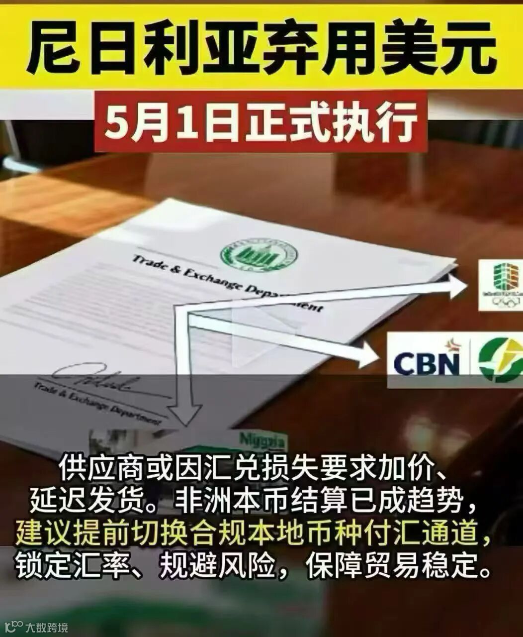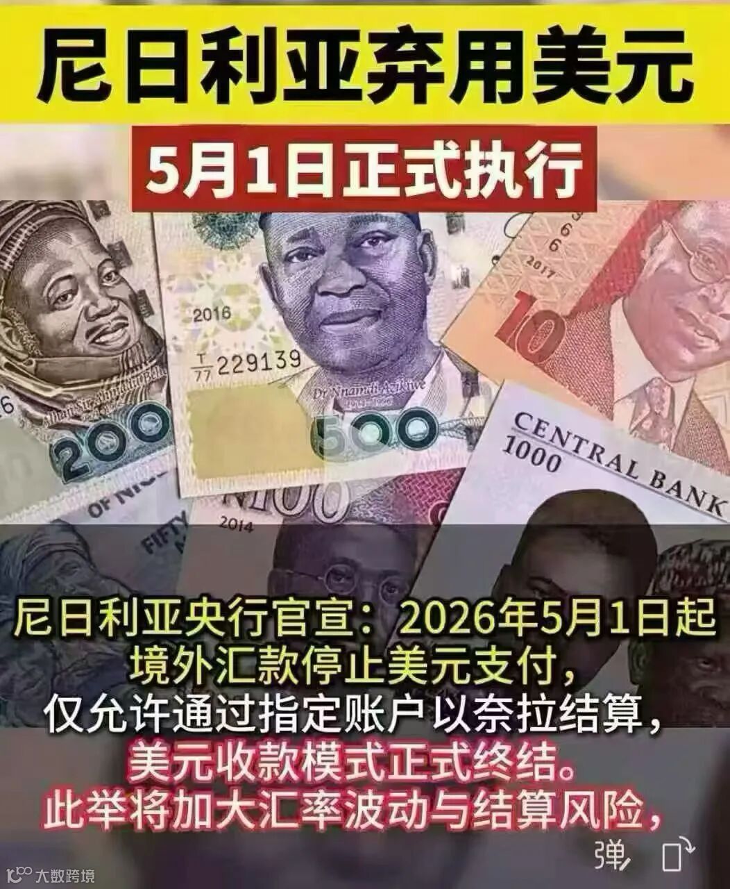 所有境外汇款须通过指定奈拉账户完成结算,取消美元等外币直接支付渠道,新规于2026年5月1日正式生效。