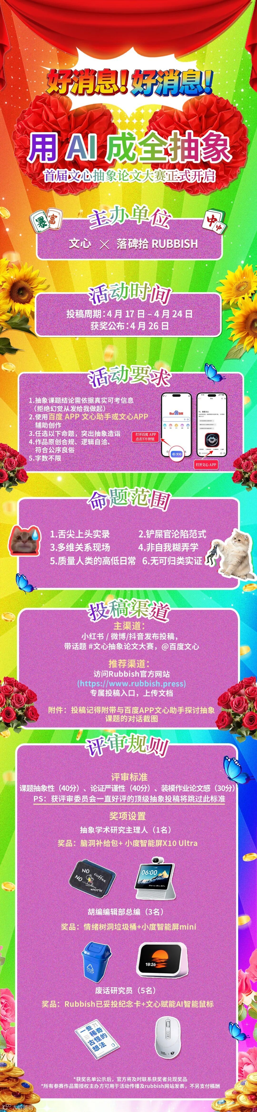 近期社交平台涌现的独特评论引发广泛思考:抽象表达虽显荒诞,却蕴含丰富创意。为系统化探索这一现象,百度文心团队联合《落碑拾Rubbish》期刊正式推出首届文心抽象论文大赛。