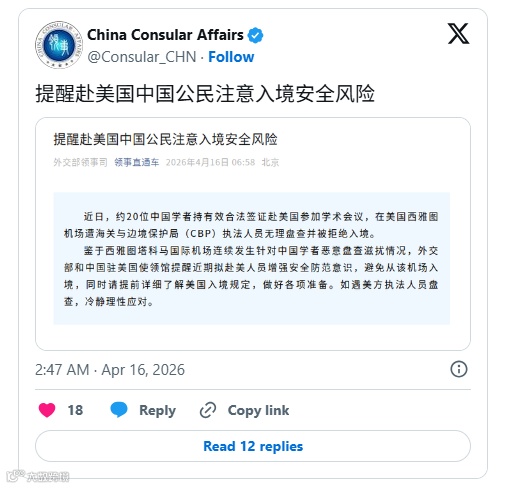 中国外交部“领事直通车”及驻美使领馆提醒,近期入境美国安全风险需警惕。