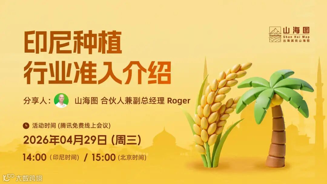 山海图将于2026年4月29日(周三)举办《印尼种植行业准入介绍》线上分享会,深度解析印尼农产品出口贸易现状、主要种植区分布格局,以及土地政策与合规要求,助力农业种植及下游加工企业精准规避风险。
