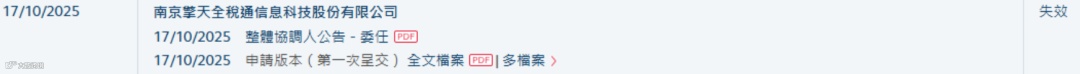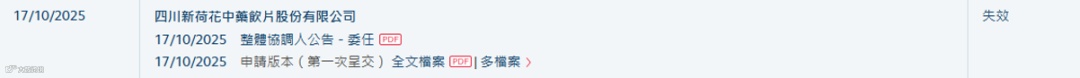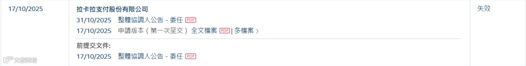 2025年10月17日,拉卡拉支付股份有限公司(简称:拉卡拉,300773.SZ)、四川新荷花中药饮片股份有限公司、南京擎天全税通信息科技股份有限公司及思卓基础设施私募资本开放式基金公司同步向港交所递交招股书。因未在6个月有效期内更新,所有申请均于2026年4月17日失效。
