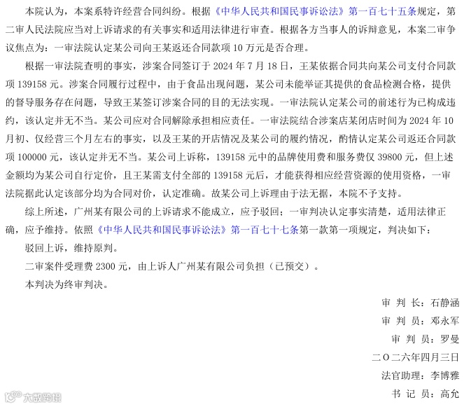 2024年7月,王某支付139158元签约获得"开心格格"品牌特许经营权。经营期间因食品检测报告缺失及服务缺陷,门店于同年10月停业。王某遂起诉要求解除合同并返还费用209872.45元。一审法院判决合同于2025年4月16日解除,特许方返还10万元,二审维持原判。