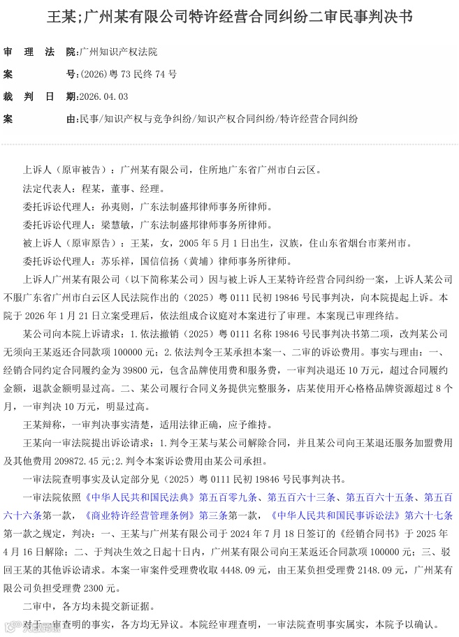 2026年4月3日,广州知识产权法院就特许经营合同纠纷案作出终审判决:特许方广州某有限公司构成违约,导致加盟商王某合同目的无法实现。