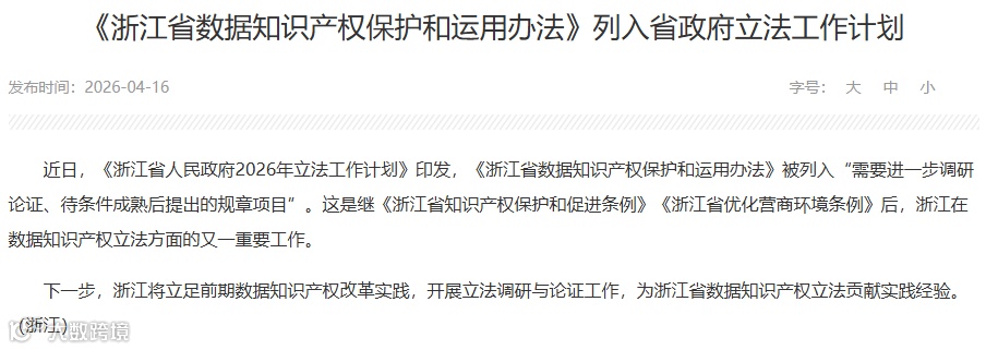 浙江省政府近日印发2026年立法工作计划,《数据知识产权保护和运用办法》被列为需进一步调研论证、待条件成熟后推进的规章项目。