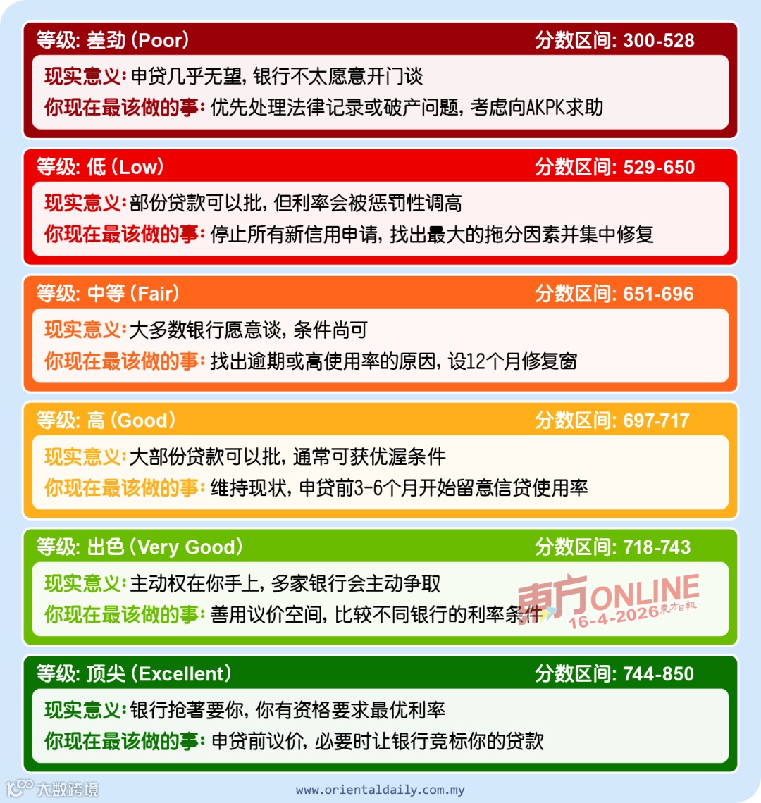 CTOS将300-850分划分为六个等级,直接影响贷款结果。各等级需针对性优化信用表现: