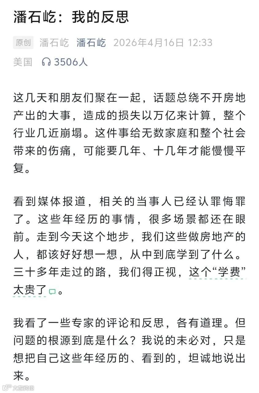 潘石屹《我的反思》事件折射房地产转型与经济深层改革