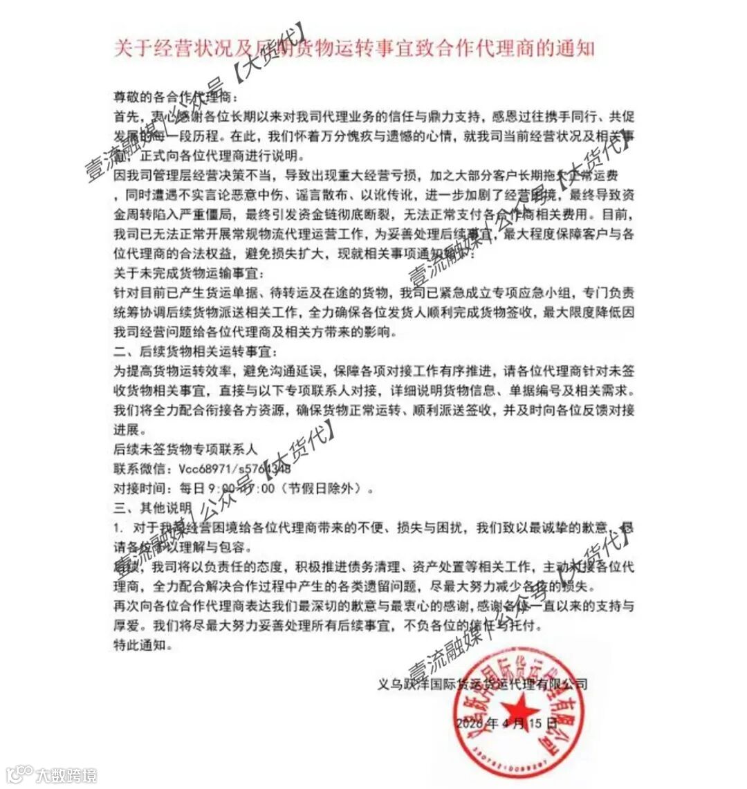 4月15日,义乌跃洋国际货运代理有限公司发布《关于经营状况及后期货物运转事宜致合作代理商的通知》,确认公司资金链已彻底断裂,无法支付合作商费用,常规物流业务已停止运营。