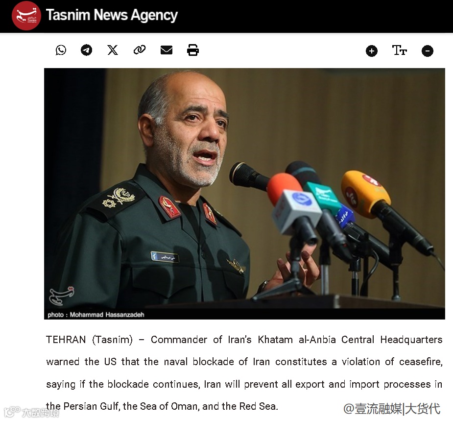 美军宣布封锁伊朗港口船只通行后,伊朗方面再度发出严正声明。