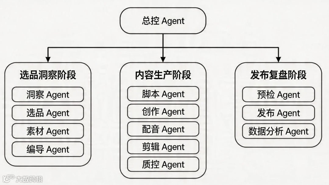 系统内置"12Agent协同体系":1个总控Agent,选品洞察阶段4个Agent(洞察、选品、素材、编导),内容生产阶段5个Agent(脚本、创作、配音、剪辑、质控),发布复盘阶段3个Agent(预检、发布、数据分析)。每位用户拥有专属AI团队,10000名达人同时使用即对应12万个Agent并行运转。