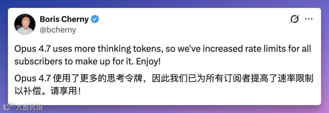 Opus 4.7定价维持输入5美元/百万token、输出25美元/百万token。采用新分词器后同等内容token消耗增加1.0至1.35倍,Anthropic通过提高用户额度上限平衡影响。更新节奏保持约70天周期,当前版本已全面覆盖网页端、API及第三方平台。