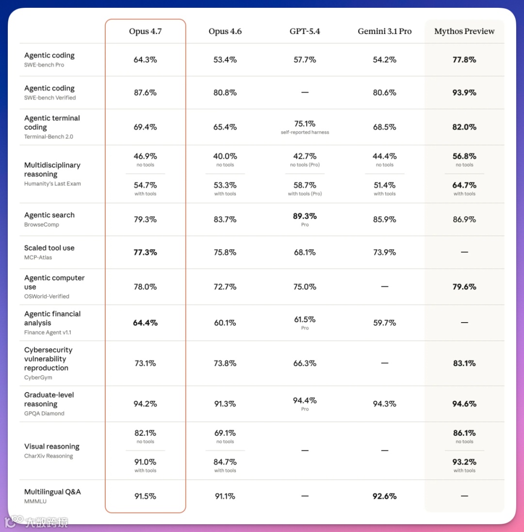 Anthropic确认Opus 4.7不及内部模型Mythos Preview:后者在SWE-bench Verified和Pro测试中分别达93.9%与77.8%。该模型因网络安全能力过强,目前仅限小范围合作伙伴测试。