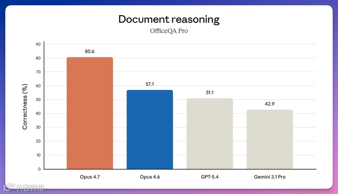 OfficeQA Pro测试准确率从57.1%提升至80.6%,增长23.5个百分点。复杂PDF及合同识别错误率显著下降,处理精度接近翻倍。