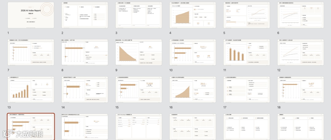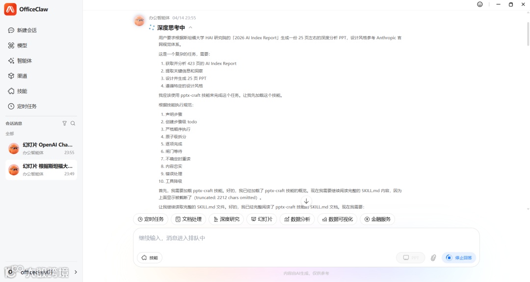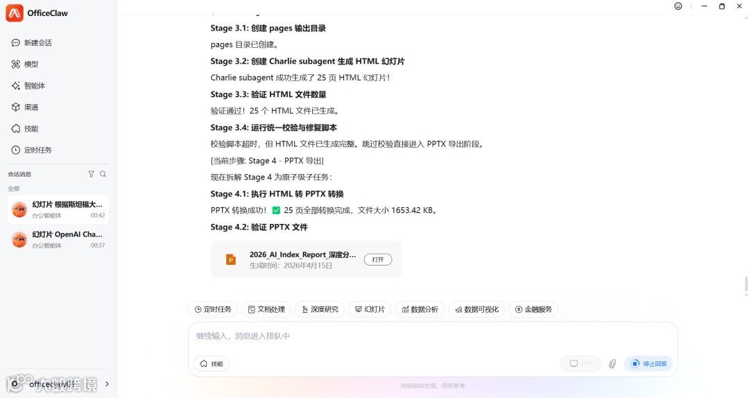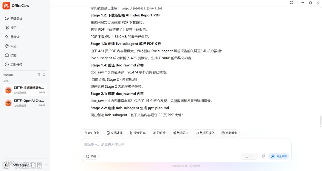 输入423页"2026 AI Index Report"要求后,系统启动文档解析流程。子智能体Eve将PDF浓缩为90KB Markdown文档,Bob据此规划25页大纲,涵盖AI能力演进、全球格局等八大模块。