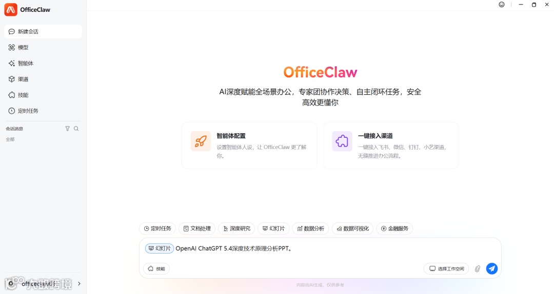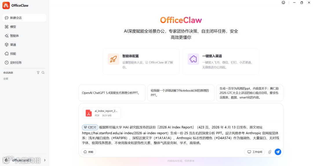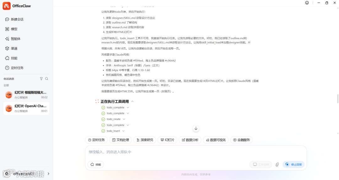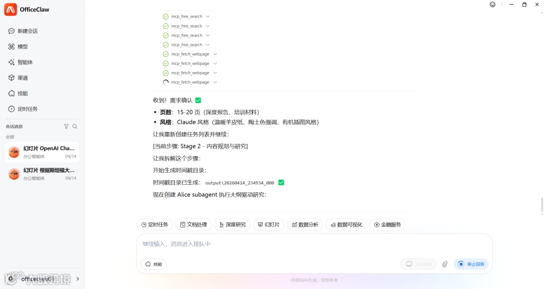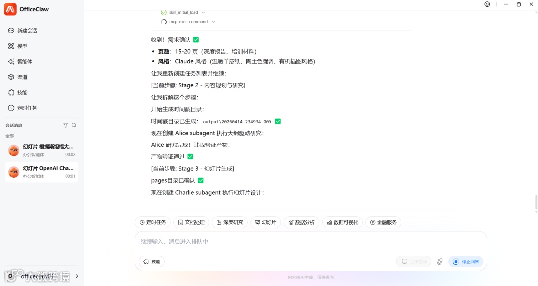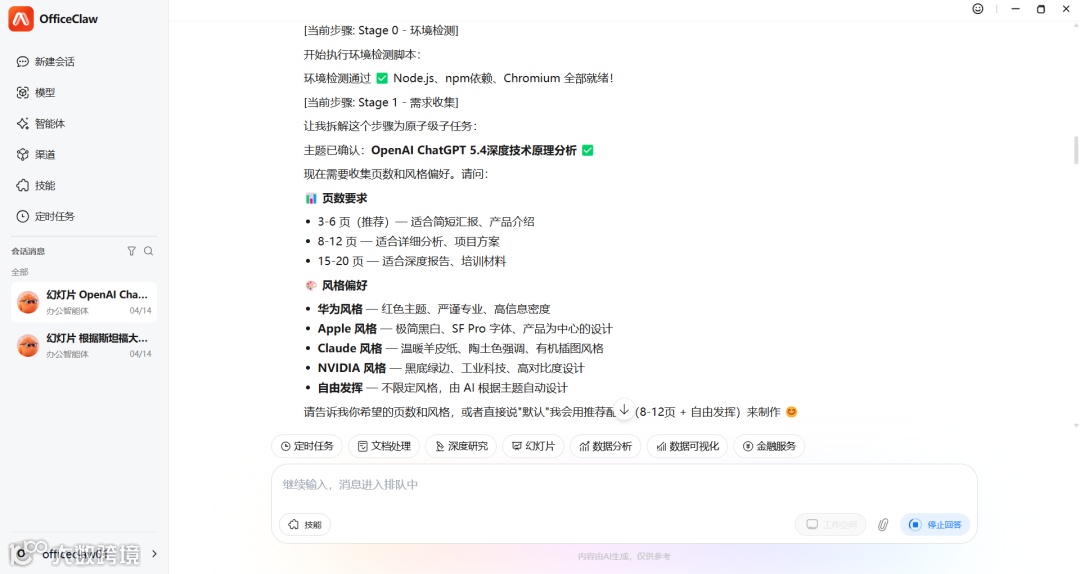 华为云率先实现该范式,推出办公龙虾"OfficeClaw"。依托自研Harness工程底座,OfficeClaw整合任务规划、多Agent协同、工具调用、记忆演进及安全治理功能。实测显示,仅需一句提示词,30分钟即可生成18页专业级深度分析PPT,全过程自主协作。