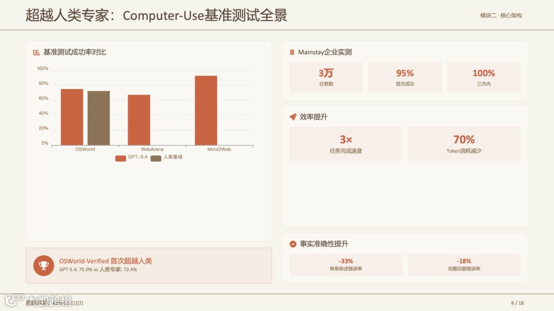 系统校验18个HTML文件后,转换为PPTX格式。成品PPT包含技术演进脉络、Computer-Use性能基准等专业内容,无模板化痕迹,符合深度技术报告标准。