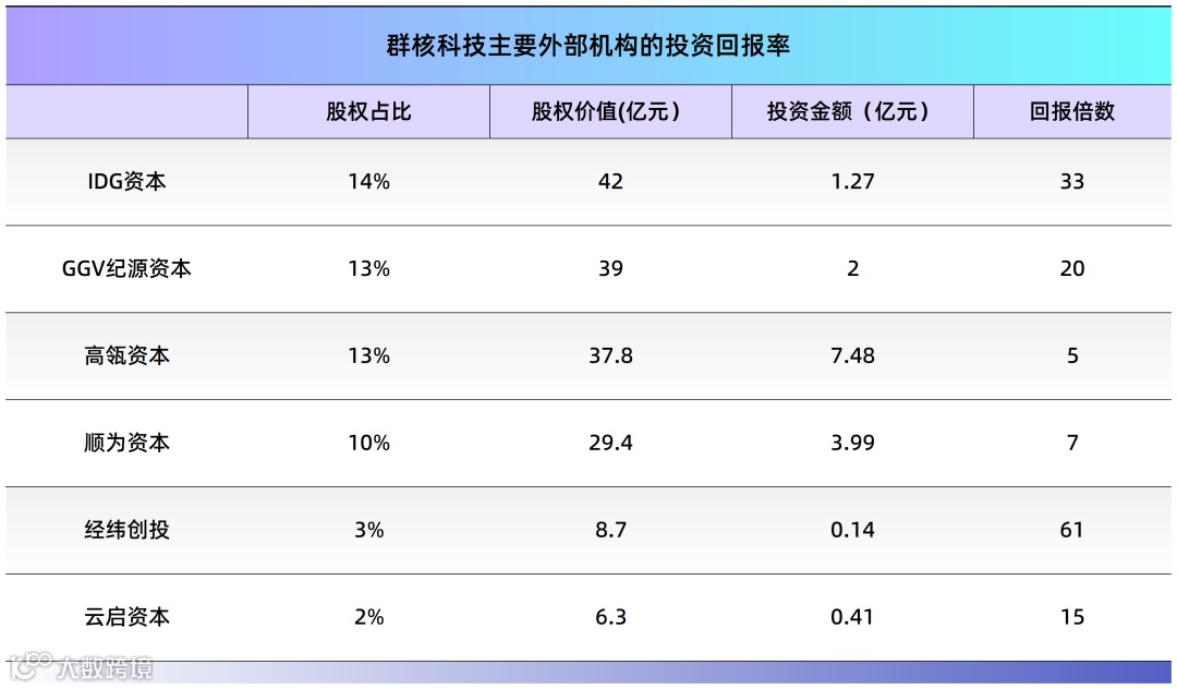,集结IDG资本、GGV纪源资本、高瓴资本等头部机构。IDG资本自2014年A轮进入并连续加注,上市前持股14%,对应价值42亿元,账面回报达33倍;GGV纪源资本、高瓴资本、顺为资本分别持股13%、13%、10%,对应价值39亿、38亿、29亿元。