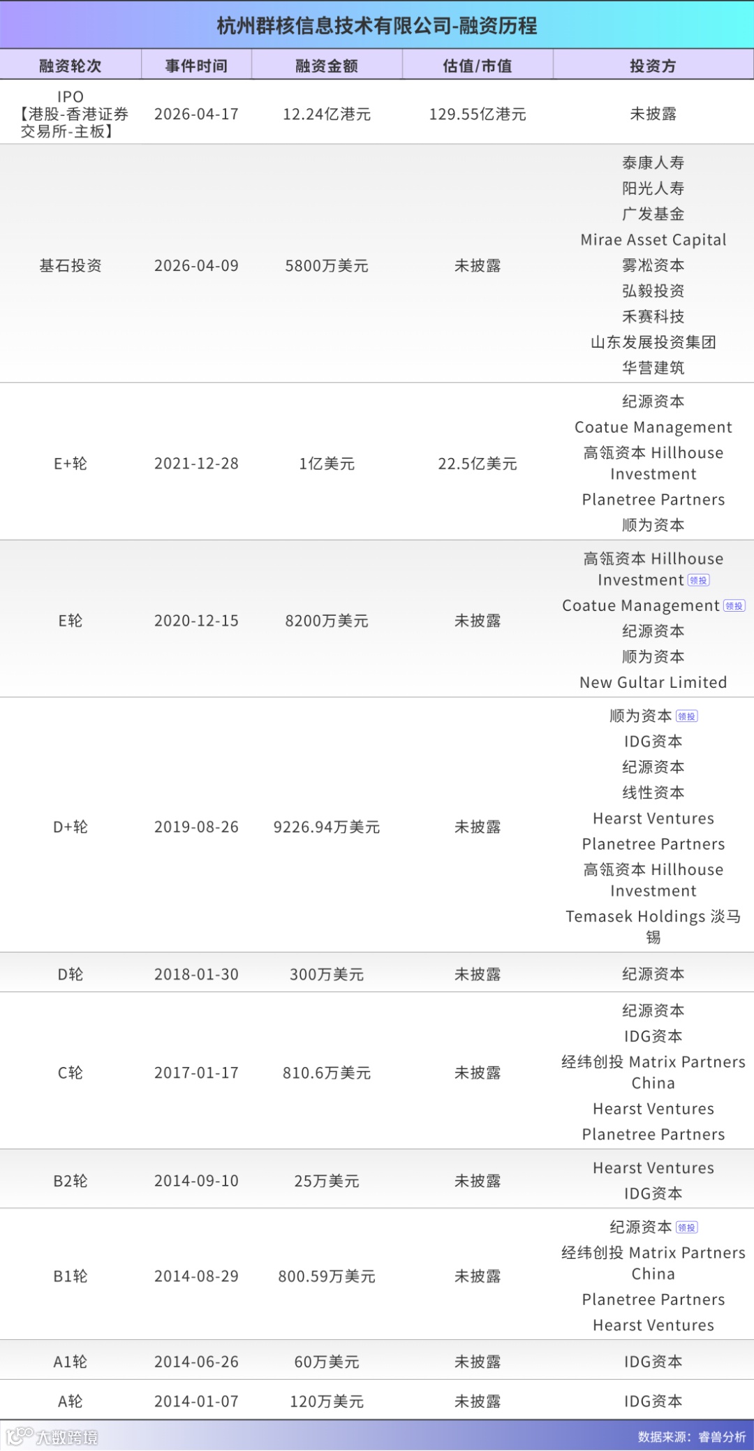 投资关键节点显现机构远见:2017年产品技术验证完成,IDG协助规范董事会并推动出海;2020年商业化加速期,高瓴资本领投D+1轮。经纬创投以0.14亿元投资获8.7亿元对应价值,回报倍数达61倍,成本轮IPO最亮眼投资案例。