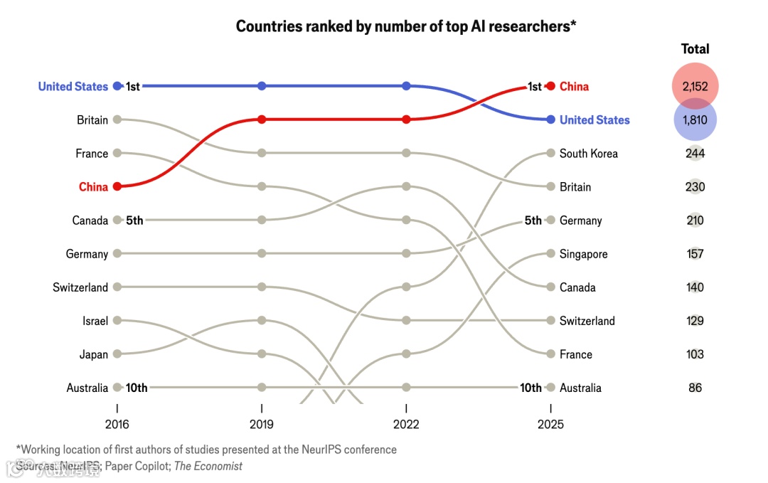 中国正成为全球AI核心人才源:2025年NeurIPS会议50%研究人员早期教育来自中国(2019年仅29%),论文作者本科院校前十名中九所为中国高校,清华毕业生占比达4%,远超MIT的1%。我国同时以60%的全球占比,成为人工智能专利最大拥有国。