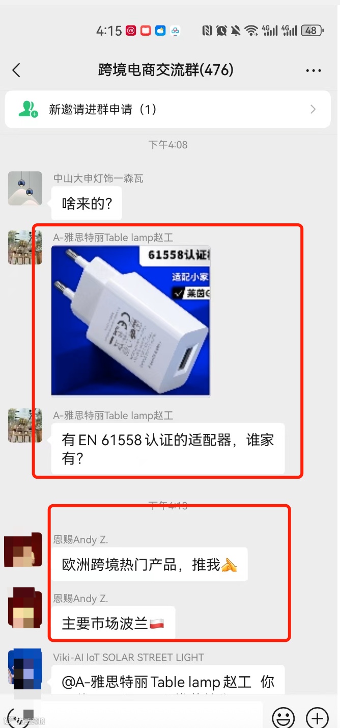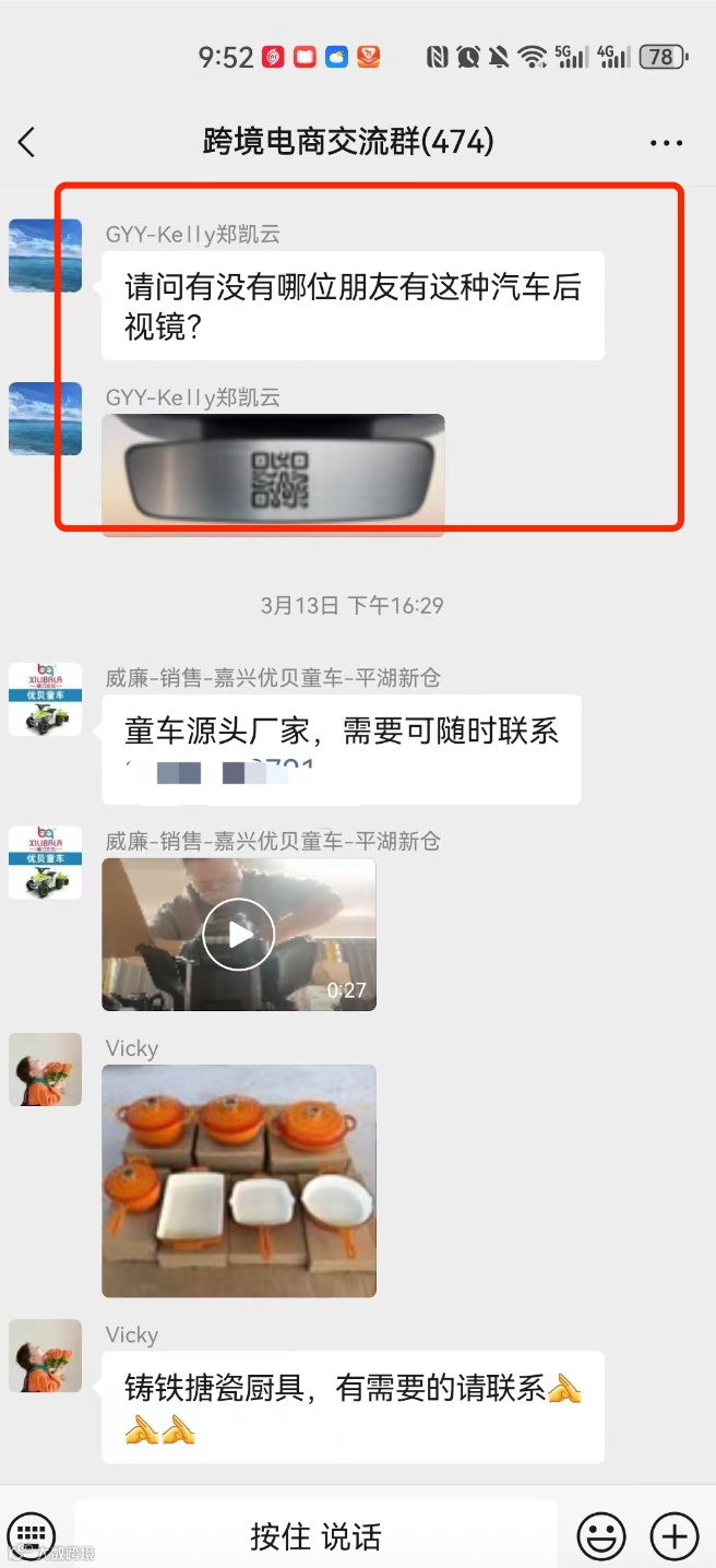 跨境电商交流群现有470余位成员,涵盖外贸公司、生产工厂负责人、外贸经理及业务员。群内支持发布文字、图片、视频形式的采购信息与产品信息,促进同业合作。