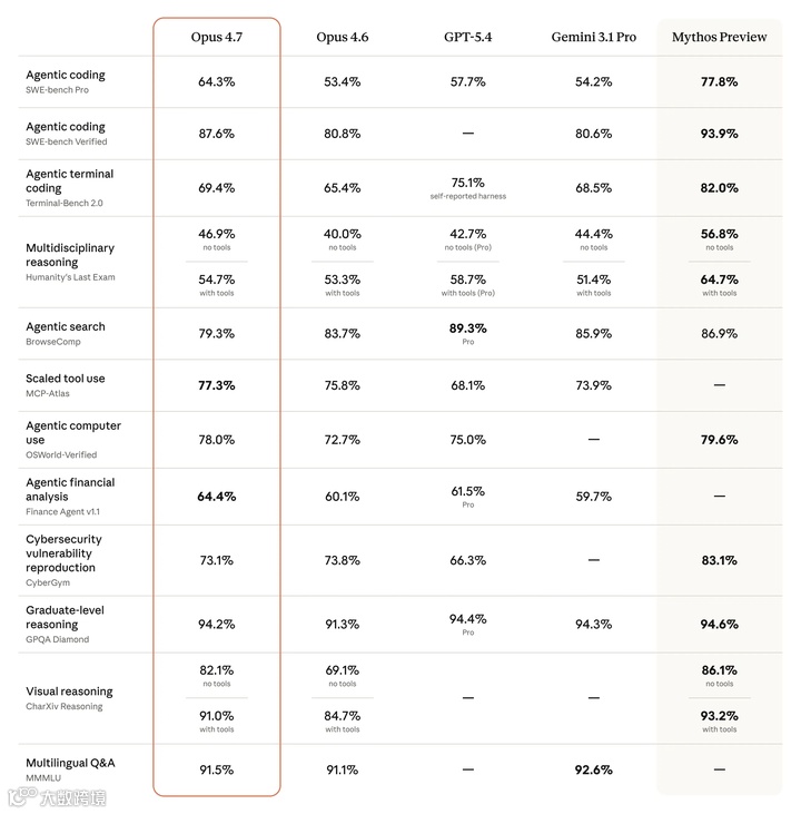 作为Mythos的"安全降级版",Opus 4.7仍是当前公开可用的顶尖模型。以下从六大维度解析其核心升级: